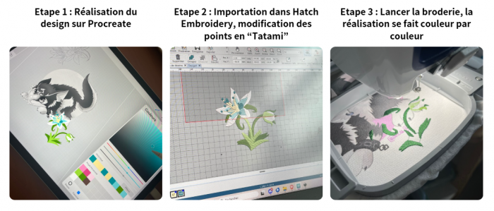 Logiciels utilisés : Procreate, Inkscape, Hatch Embroidery